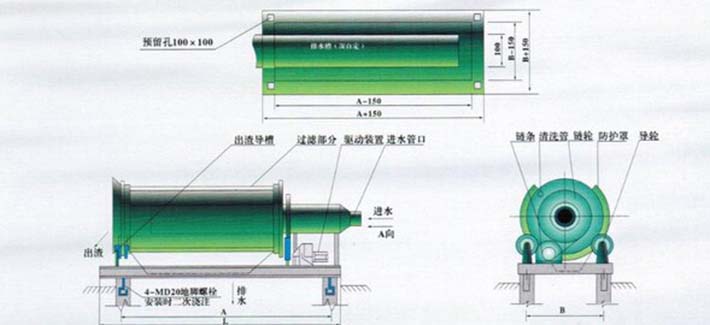 處理水從水管進入溢流堰布水器,經短暫穩流后,由出水口均勻溢出,分布在反方向旋轉的濾筒濾網上,水流與濾筒內壁產生相對剪切運動,過水效率高,固形物被截流分離,順著筒內螺旋導向板翻滾,由濾筒另一端排出。濾液從水槽中流走。該機濾筒外配有沖洗水管,沖洗水壓力(3kg/㎝2),呈扇形噴射以沖洗疏通濾網,保證濾網始終保持良好的過濾能力。